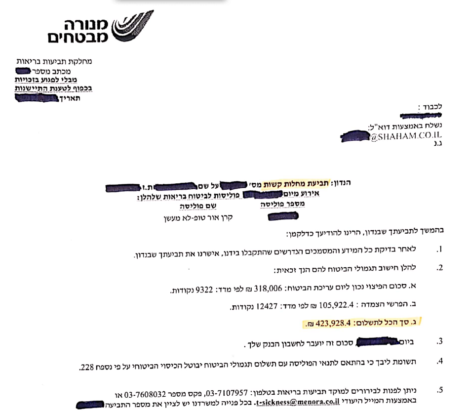 אישה בת 46 שחלתה בסרטן ופוצתה ב-423,928 ₪ מפוליסת מחלות קשות, אחרי התעקשות מצידי שהמחלה שלה אכן אמורה להיות מכוסה לפי הפוליסה.