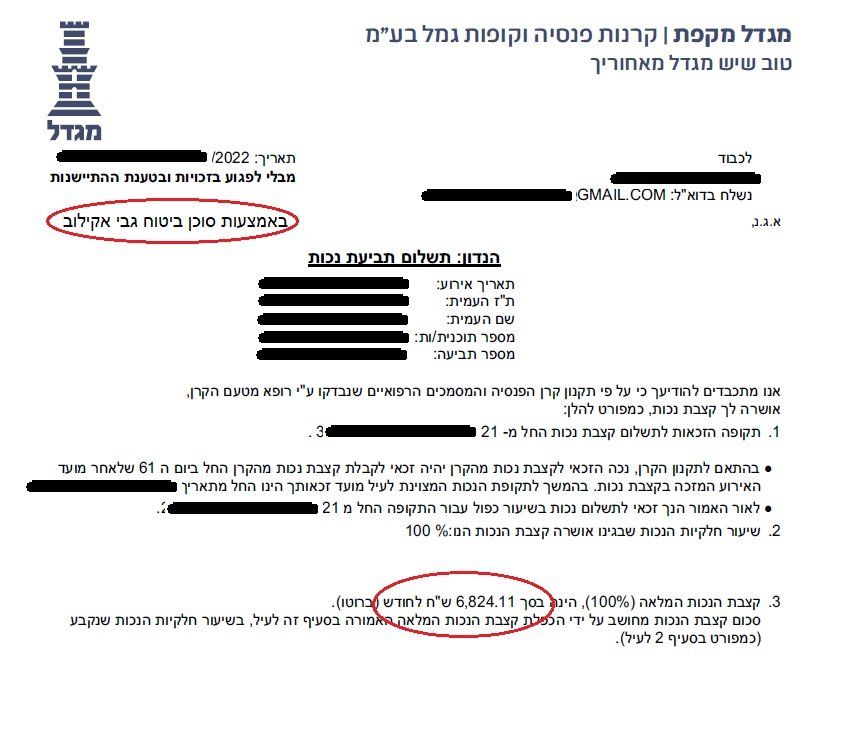 מבוטחת שלנו, מקבלת קצבת נכות קבועה של 6,824 ₪ לחודש אחרי שחלתה בפרקינסון בגיל צעיר יחסית.