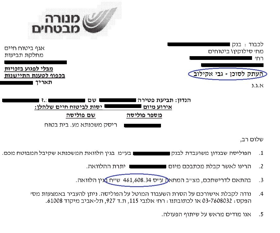אחרי שמבוטח בן 53 נפטר בפתאומיות, חברת הביטוח שילמה את סכום הביטוח לבנק למשכנתאות ויתרת המשכנתא סולקה. האלמנה לא נשארה עם החוב.